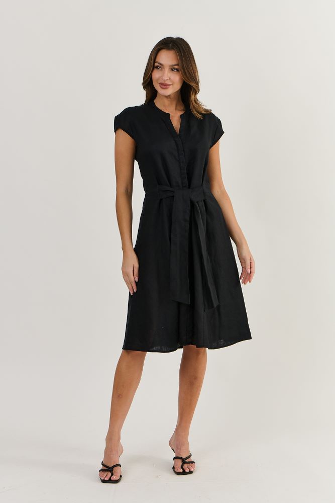 This is a gorgeous linen dress that will flatter anyone. The cap sleeves and a placard extends from the v-neck and leads to a wide waist tie that gives a gorgeous shape to this dress. The skirt flows beautifully into a hem that floats just under the knee. Made from 100% linen.
